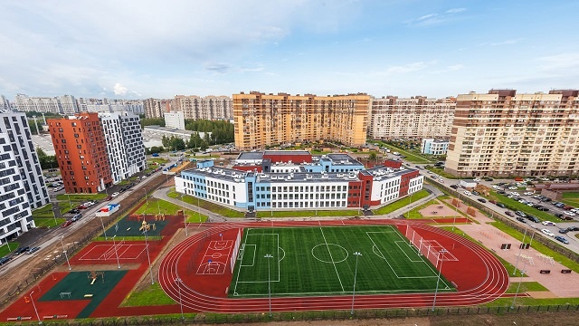 Школа, рассчитанная на 834 места, построена в жилом квартале «Мурино Space», официальный адрес - город Мурино, улица Шоссе в Лаврики, дом 53, корпус 1. Общая площадь составляет 19 тыс. кв. м, девелопер проекта – группа ЦДС. Трехэтажное здание включает блоки для начальной и старшей школы (с отдельными входами) и общешкольный блок. Для учеников «продленки» в отделении начальной школы предусмотрены не только учебные помещения, но и спальни‐игровые. В здании расположены три спортзала с раздевалками и душевыми, просторный актовый зал на 567 мест, библиотека, столовая на 452 места, мастерские, кабинет психолога и медицинский блок. На пришкольной территории создана инфраструктура для занятий спортом: поле для футбола, площадки для волейбола и баскетбола, дорожки для бега и прыжков в длину, площадка для занятий по ПДД. «Здание возвели практически за год, и это задаёт новую планку в темпах создания социальных объектов, - отметил Евгений Барановский, зампред правительства ЛО. - Новая школа про