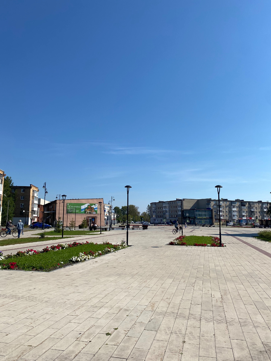 По прибытии в Туринск мы сразу окунулись в прогулку по уютным улочкам города. Первым делом осмотрели площадь Октября. Большая, ухоженная и красивая площадь. Особенное впечатление произвёл динамический фонтан на площади, в котором охлаждались голуби (стояла жара в этот день).