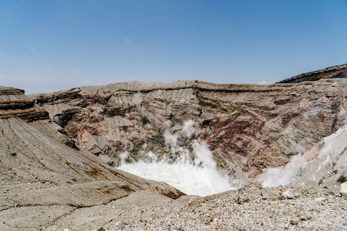 Я не просто так сказала в начале, что нам очень повезло, кстати. Мы только-только осмотрели зоны B-2 и B-1 и наделали фотографий, как взвыла сирена. Дышать стало действительно трудно, я почти все время кашляла, как будто песок в горло насыпали. По громкоговорителю на японском сообщали про опасность, и сотрудник отчаянно гнал туристов на ломанном японско-английском подальше от кратера. Маячок горел красным. За считаные минуты территория опустела.