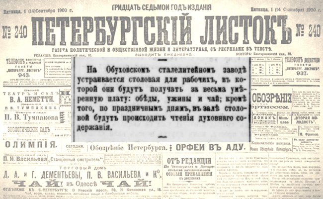 На Обуховском сталелитейном заводе устраивается столовая для рабочих, в которой они будут получать за весьма умеренную плату: обеды, ужины и чай; кроме того, по праздничным дням, в зале столовой будут происходить чтения духовного содержания.