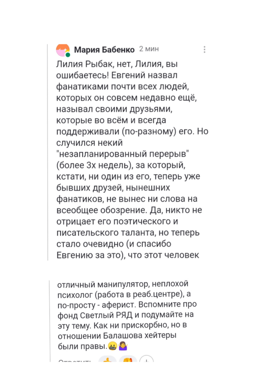 Здравствуйте! Статья будет короткой, практически ответом на комментарий Марии Бабенко. Единственное, в чём оказалась права Мария, так это в том, что Лилия не знает предыстории... Впрочем, и Мария сама либо её не знает , либо знает с чужих слов, либо не/сознательно искажает факты. Я не питаю никаких иллюзий относительно того, что в Дзене историю с моим перерывом не только не осветят с разных ракурсов, но и не растянут по времени смакования на долгие недели. Осветят и растянут. Поэтому от первого лица, так сказать. У меня был срыв. Запой. Долгий и жестокий. За время которого в моём, теперь уже бывшем ТГ-канале, все те, кого я назвал фанатиками и ждунами, весело поупражнялись в добивании упавшего "друга". Перед друзьями, которые отнеслись с пониманием и поддержкой, я извинился. Никого лично не обвинил, не назвал фанатиком и ждуном, все, кто продолжает лить фекалии в мой адрес, натянули шевроны с отличительными знаками самостоятельно и с мазохистским удовольствием. Всё, что я сейчас написа