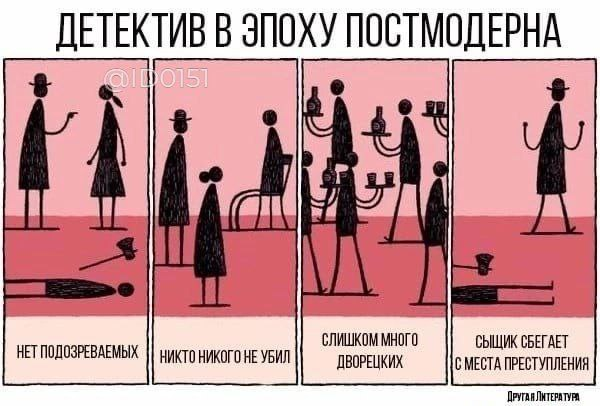 Поэтому авторы-постмодернисты часто игнорируют читателя и/или не отвечают на его вопросы. В модерне автор Бог, в метамодерне автор — участник диалога, а в постмодерне автор не пытается понравиться. Он часто провоцирует читателя, игнорирует его ожидания, ломает ритм и исчезает за секунду до развязки. И это нормально.
