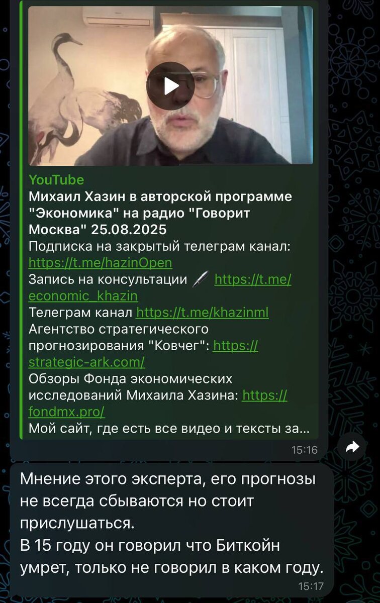 Do not trust, verify: почему не стоит слушать экспертов На днях мне скинули в личку стрим Михаила Хазина. Честно, я редко смотрю русскоязычных экономистов — просто потому что чаще всего это похоже на теоретический клуб по интересам. Экономисты могут хорошо разбирать прошлые события или рисовать схемы заговора, но когда доходит до технологий — особенно новых, вроде биткоина, — там начинается туман. Послушал 25 минут — и у меня было чувство, что читаю книгу, после которой в голове только больше ваты. Никакой ясности, никакой логики. Заговоры, хитросплетения, интриги, но к чему это всё? Какой вывод? Я так и не понял. Для меня это психологическая мясорубка: слушаешь, но мозг отказывается собирать картину. Я не люблю такой контент, где вместо фактов и логики — домыслы. И особенно не люблю прогнозы «биткоин обнулится» от людей, которые его, мягко говоря, не изучали. Тут есть два лагеря. Первый — как Питер Шиф. Он хоронит биткоин не потому, что не понимает его, а потому что ему выгодно.