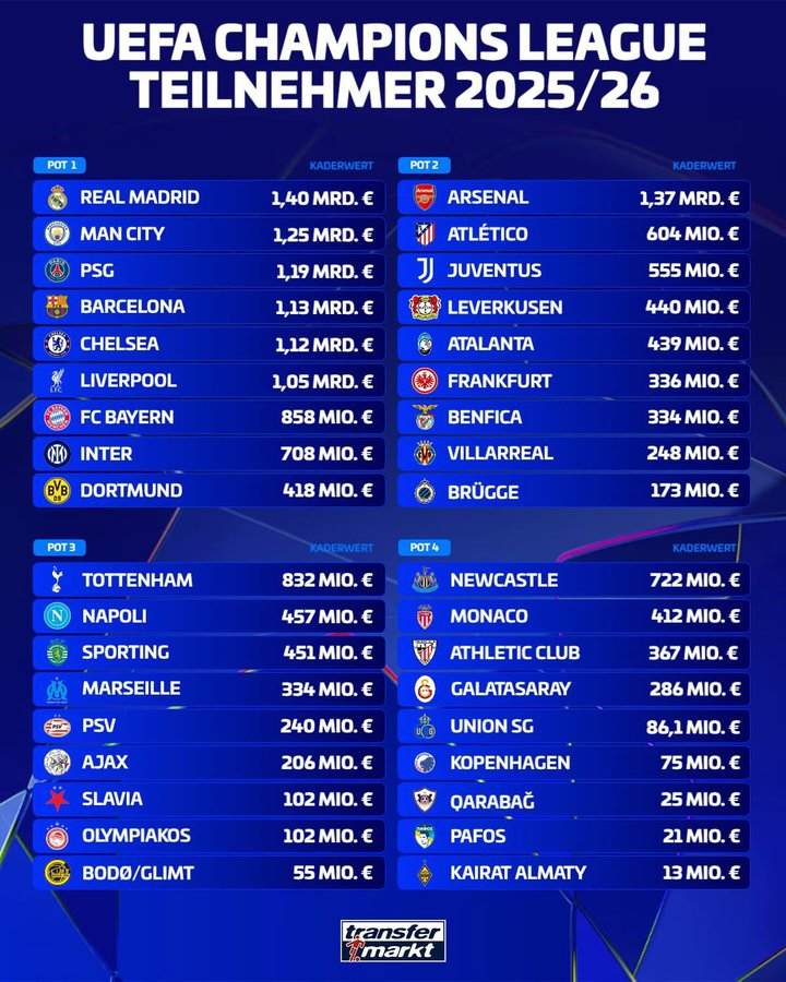 Как обычно, Transfermarkt первый отреагировал на итоги последнего квалификационного раунда Лиги чемпионов, который определил то, как будут выглядеть четыре корзины перед жеребьевкой. Следом появилась таблица стоимости составов всех участвующих команд. Мы помним, что раньше в первую корзину попадали только чемпионы стран, но теперь все они формируются по коэффициентам УЕФА. И мы видим, что в первой девятке сразу шесть клубов, чьи составы оценивают в более чем миллиард. Лидер, конечно же, «Мадрид» (1,4 млрд), а следом идут «Манчестер Сити» (1,25 млрд) и «ПСЖ» (1,19 млрд). Можно сделать вывод, что еврокубковую стабильность можно купить за большие деньги. Правда, с этим не согласен «Дортмунд» (418 млн) и «Арсенал», чей состав оценивают в 1,37 млрд, но при этом команда попала во вторую корзину. С остальными данными вы можете ознакомиться на картинке. Жеребьевка начнется в 19:00 по мск.