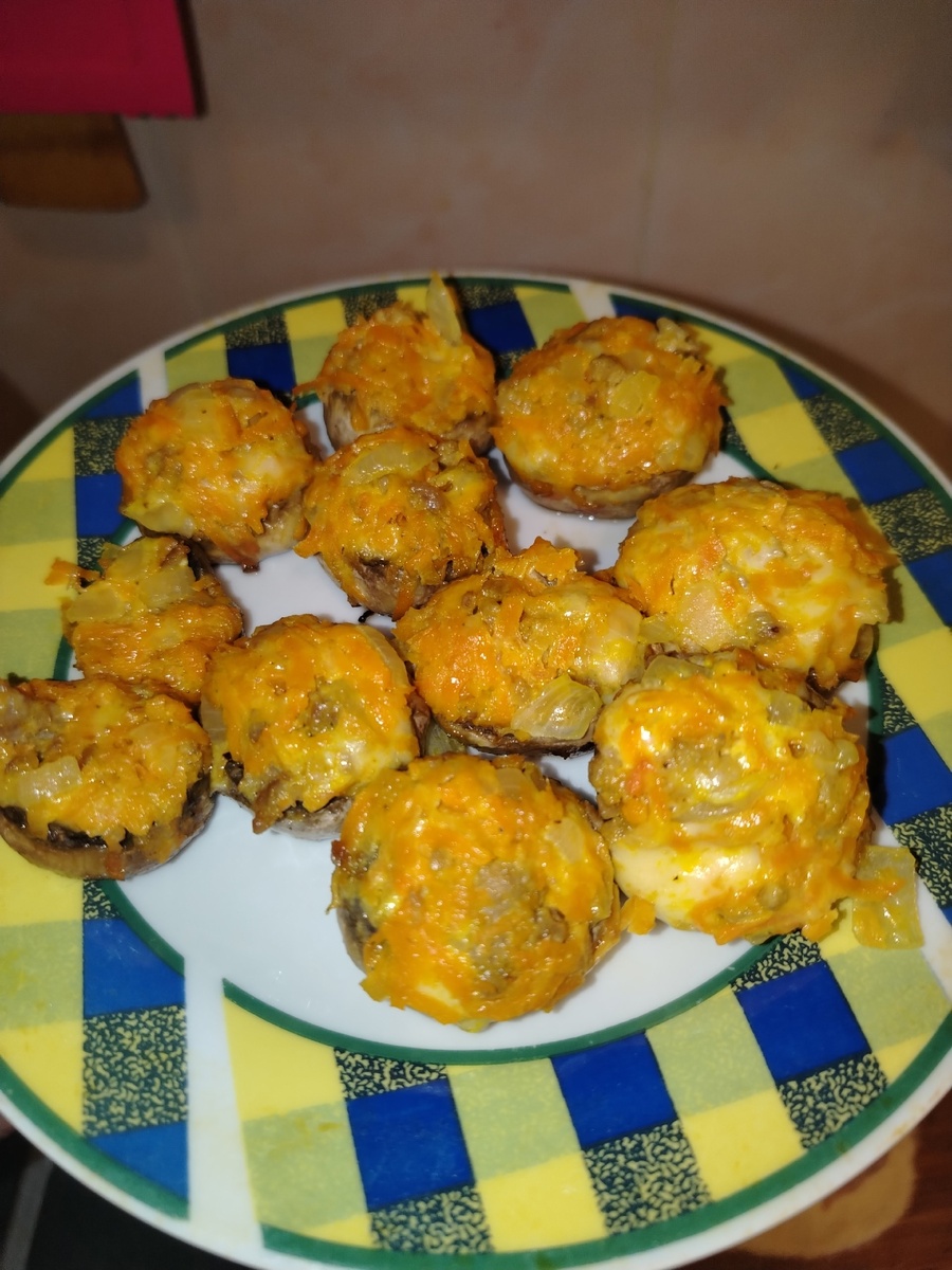Натереть сыр на мелкой терке Остудить пережарку, добавить майонез и сыр, Удалить ножку гриба, почистить Затрамбовать ложкой начинку в гриб