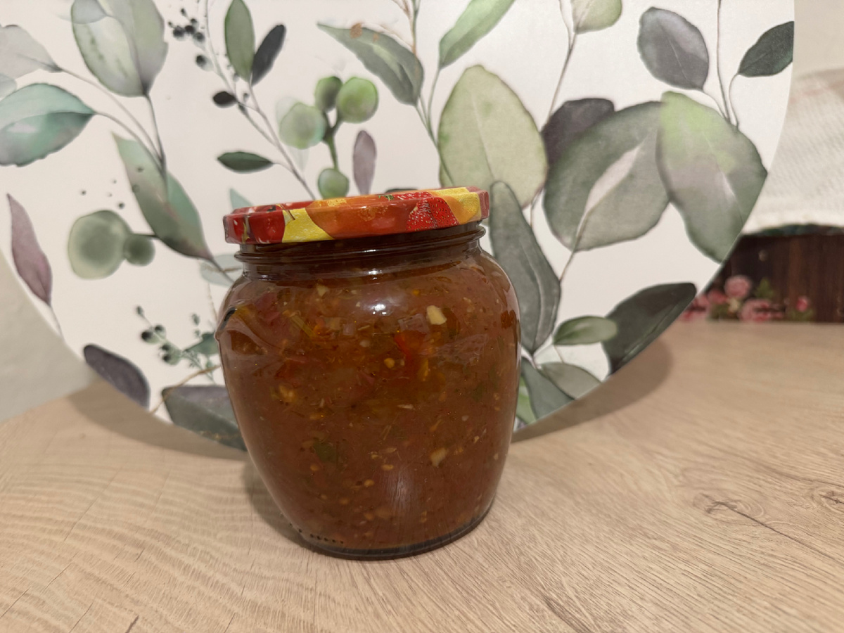 Ингредиенты: помидоры - 5 кг чеснок - 150 г зелень - 1 кг ( 400г укроп, 400г петрушка, 200 г кинза) по желанию можно добавить свою зелень соль 60 г сахар 160 г перец черный 2 ч л масло подсолнечное 200 мл перец острый (добавляем по вкусу меньше - больше) 9 % уксус - 5 ст л Помидоры промываем и прокручиваем через мясорубку и ставим варить. Варим 15 минут после закипания. Пока готовим чеснок. Его можно либо натереть, либо мелко нарезать. По желанию. Так же нарезаем зелень. По истечении 15 минут в кастрюлю добавляем чеснок, зелень, специи, масло, острый перец (измельченый), уксус. Варим еще 10-15 минут и закатываем. Соус получается вкусным. Можно просто поесть с хлебом. Так же можно использовать для маринования мяса для запекания.