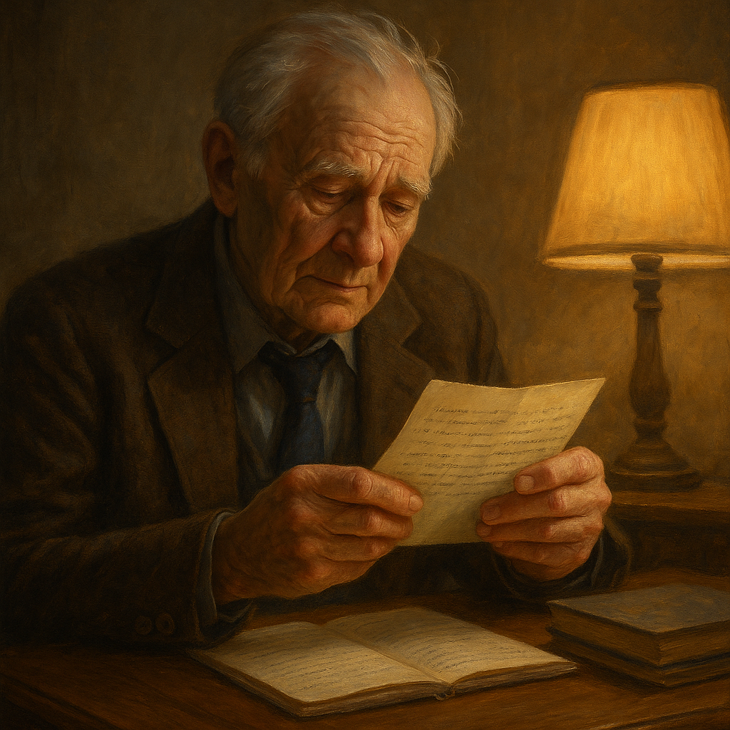Вечером он долго сидел за столом, перед собой положив письмо. В комнате тикали часы, из кухни доносился запах заваренного чая. Он перечитывал строки снова и снова. Казалось, что вместе с ними в дом вошёл кусочек прошлого.