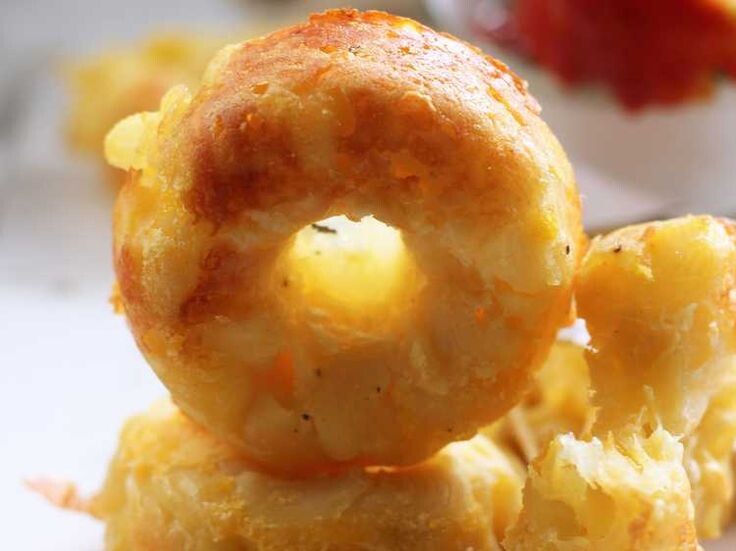 125 г сливочного масла, 250 мл (1 стакан) воды, 160 г (1 стакан) пшеничной муки, 4 яйца, 100 г (1 стакан) тёртого сыра, 50 г (1 шт.) репчатого лука. Налить воду в миску, накрыть её, поставить в микроволновку на 7-10 мин. На полной мощности и довести до кипения. Добавить в кипяток осторожно муку и хорошенько перемешать. Вбить туда же по одному яйца, каждый раз хорошо взбивая смесь. Потом добавить сыр и мелко нарезанный лук, хорошенько всё перемешать. Нагреть смесь до 200°С, ложкой выложить ее на смазанный противень для пиццы и выпекать в течение 20-24 мин. на средней мощности.