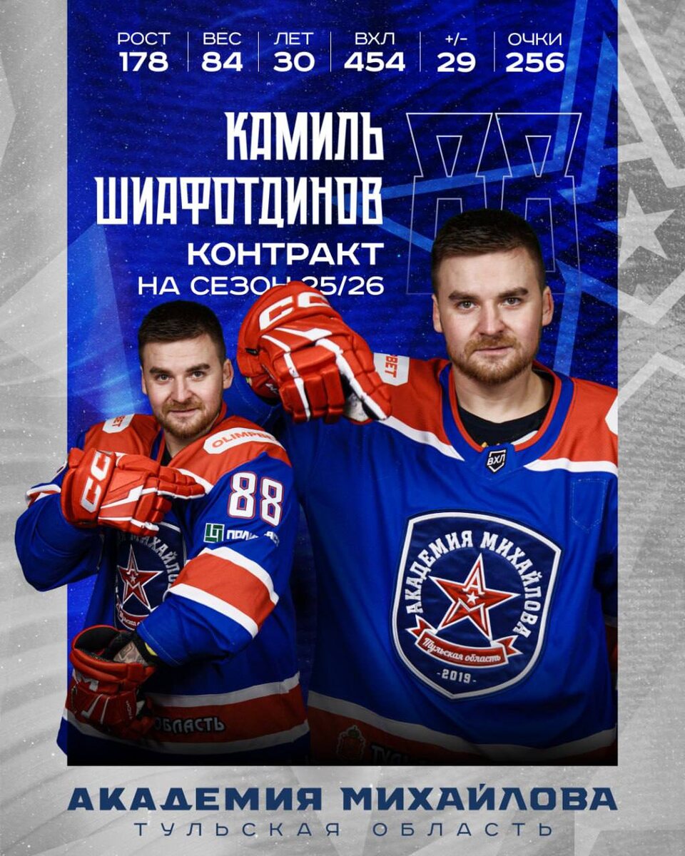 ↔️Камиль Шиафотдинов перешел в тульский АКМ Ранее в ВХЛ нападающий отыграл в общей сложности 454 встречи, защищая цвета воскресенского «Химика», китайского «Ценг Тоу», курганского «Зауралья», альметьевского «Нефтяника», пермского «Молота» и «Югры» из Ханты-Мансийска. За период с 2015 года хоккеист заработал 256 очков (71 шайба и 185 передач) при коэффициенте полезности +29. Кроме того, у форварда есть опыт игры в КХЛ – он выступал за подмосковный «Атлант» и хорватский «Медвешчак». Два последних сезона 30-летний форвард провел в курганском «Зауралье», которое он покинул после окончания сезона. В прошлом сезоне команда заняла 12 место в регулярном чемпионате и завершила свой путь в первом раунде плей-офф, проиграв «Химику». Летом он подписал контракт с «Юнисоном», но тот снялся с чемпионата ВХЛ. 📸ХК АКМ @nhockey