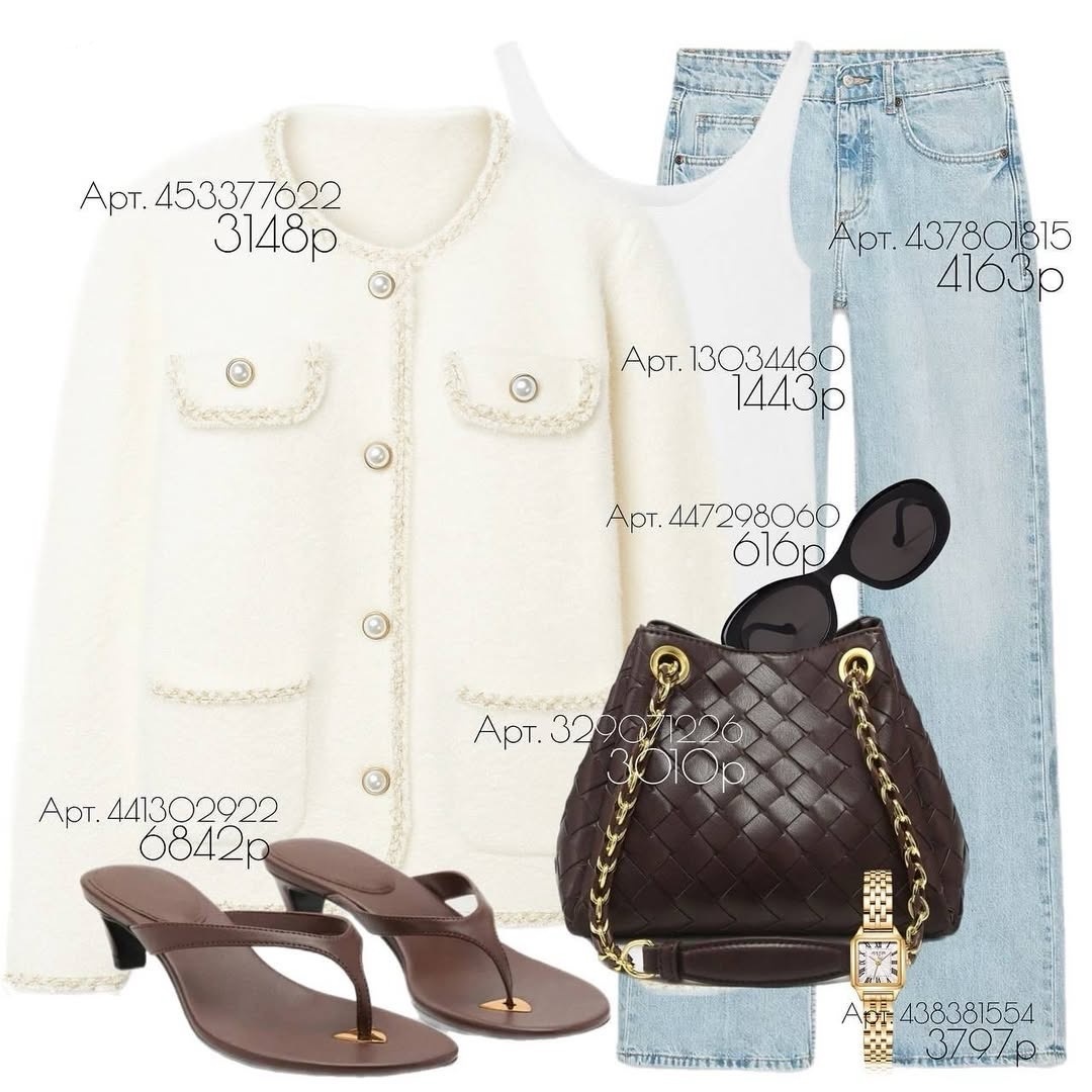 Нежная молочная текстура, хрустящий светлый деним и глубокий шоколад аксессуаров — сочетание, которое выглядит как дорогой минимализм без усилий. Такой сет уместен и днём, и вечером: в офис без строгого дресс-кода, на свидание, в город на выходные. Ниже — полный разбор каждой позиции с артикулами и точными советами стилиста, чтобы собрать и адаптировать образ под себя. Кардиган в духе «old money»: мягкое букле, округлый вырез, карманы-клапаны, перламутровые пуговицы и аккуратная тесьма по бортам. Молочный оттенок «подсвечивает» лицо, а прямой силуэт садится поверх майки, водолазки или платья-комбинации. Совет стилиста. Носите расстёгнутым на одно верхнее плечо — так видно линию ключиц и создаётся лёгкость. Для фигуры «песочные часы» подчеркните талию тонким ремнём в цвет обуви. Гладкая белая майка с идеальной проймой и закрытой линией груди — та база, которая делает комплект чистым и современным. Плотность держит форму, не просвечивает, удобно заправляется в деним. Совет стилиста. Есл