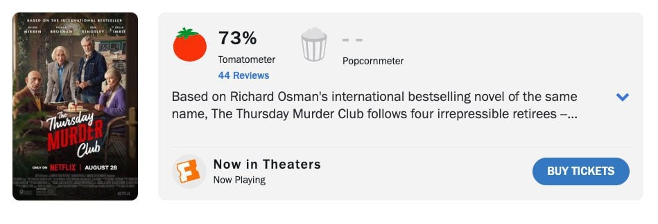 🎬 Фильм «Клуб убийств по четвергам» теперь доступен в бесплатных онлайн-кинотеатрах — эта криминальная комедия вызвала положительные отзывы у критиков. — Медиа называют ленту «уютной» — в ней есть особая атмосфера, характерный английский юмор и отличная актёрская игра. — Режиссёр картины – Крис Коламбус, известный благодаря первым частям «Гарри Поттера» и «Один дома». — Сюжет рассказывает о четверке пенсионеров, которые проводят время, разбирая старые преступления из газет. Внезапно они сталкиваются с реальным убийством, и теперь им предстоит расследовать свежие преступления. — Зёздный состав, который не разочарует. В ролях: Пирс Броснан, Хелен Миррен, Бен Кингсли, Селия Имри, Ричард Э. Грант и Дэвид Теннант. Отличный вариант для вечернего киносеанса.