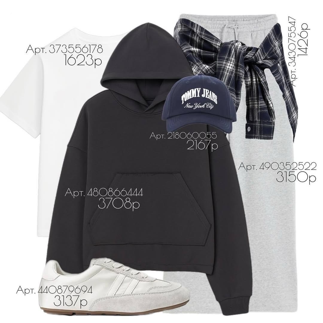 Иногда идеальный наряд — это не платье-комплимент, а продуманный athleisure: чистые линии, тактильные фактуры, правильные пропорции и одна капля дерзости. Этот комплект — именно такой. Лёгкий, комфортный, но при этом собранный и стильный. Разберём его строго по артикулам и добавим рабочие советы стилиста, чтобы сесть «как надо» на любую фигуру. Классическая бейсболка с вышивкой и изогнутым козырьком. Глубокая посадка фиксирует кепку, а тёмно-синий цвет уравновешивает чёрный худи и серую основу, создавая «спортивный» акцент в верхней части силуэта. Как носить: слегка опустите козырёк ниже линии бровей — взгляд становится выразительнее. Для объёмной причёски соберите волосы в низкий хвост, протянув его через вырез сзади. Мягкая хлопковая клетка в холодной гамме. Здесь рубашка работает не как верх, а как стилизующий пояс: завязана на бёдрах, она собирает талию и добавляет фактуру. Совет стилиста: завязывайте плотный узел чуть выше самой широкой точки бёдер — силуэт станет песочные часы.