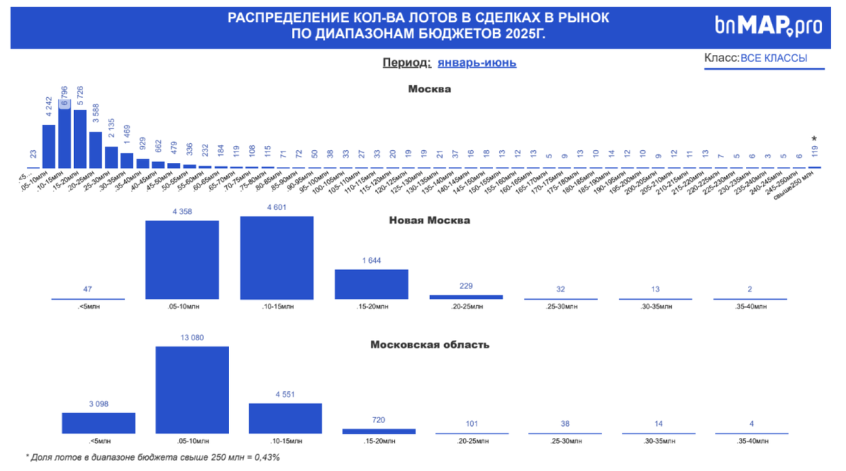 ТОП-5 проектов-лидеров по объему сделок в Москве: — «Движение. Говорово» от ФСК — 1149 —«Бусиновский парк» от ПИК — 850 — «Московречье» от ПИК — 782 — «Матвеевский парк» от ПИК — 714 — «Shagal» от «Эталона» — 706 ТОП-5 проектов-лидеров по объему сделок в Новой Москве: — «Саларьево парк» от ПИК — 2159 — «Бунинские кварталы» от «А101» — 913 — «Скандинавия» от «А101» — 769 — «Цветочные поляны» от «Самолета» — 667 — «Дзен-кварталы» от «А101» — 622 ТОП-5 проектов-лидеров по объему сделок в Московской области: — «Ильинские луга» от ПИК — 2528 — «Яуза парк» от ПИК — 1585 — «Ярославский квартал» — 785 — «Level Лесной» от Level Group — 632 — «Восточное бутово» от ПИК — 620 Презентацию смотрите по ссылке ниже: https://drive.google.com/file/d/1_YMaj0r7a9lh_BaX0nva97ocZB59VVWb/view?usp=drivesdk