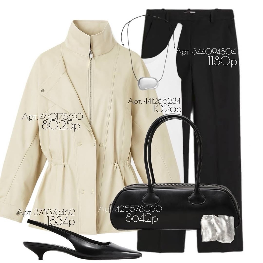 Получился универсальный сет «на каждый день», который соблюдает эстетику quiet luxury и не требует усилий: парка (арт. 460175610), брюки (арт. 344094804), белая майка (арт. 441266234), слингбэки (арт. 376376462) и сумка (арт. 425578030). Пять вещей — десятки сценариев: работа, встречи, галерея, ужин. Сохраните артикулы, примерьте — и убедитесь, как спокойные цвета и правильные пропорции вмиг собирают идеальный образ.