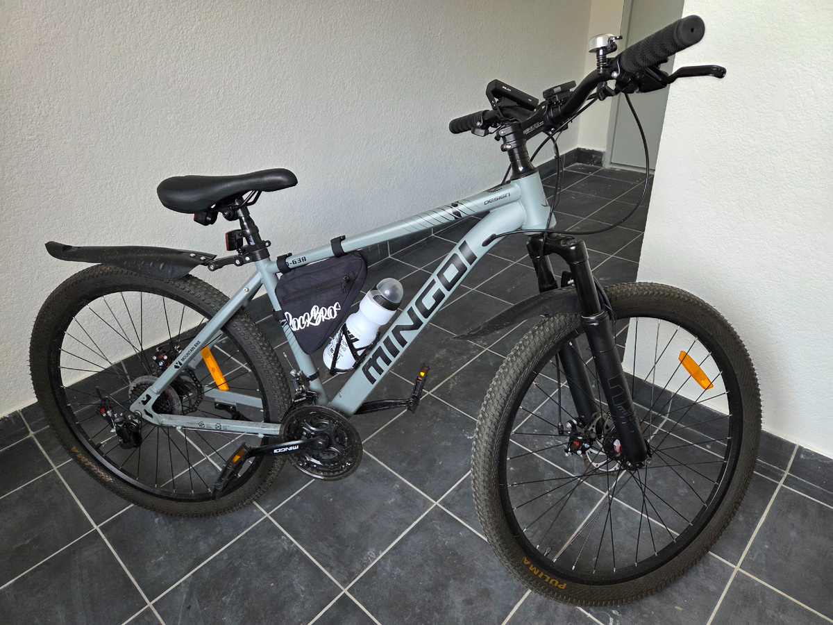 Пару месяцев назад приобрёл о это китайское чудо. Велосипед MINGOI (MINDI). Чистый китаец. Был чистый. Но после ежедневной эксплуатации местами покрылся российской грязью. Заказывал данный велосипед через маркетплейс прямиком из Китая. Цена была привлекательная — 5000 рублей. Приехал он мне в хорошем состоянии, не битый, не крашеный. Тут повезло. Собрал быстро, пришлось только повозиться с настройкой переключения скоростей. Но вроде более-менее настроил.