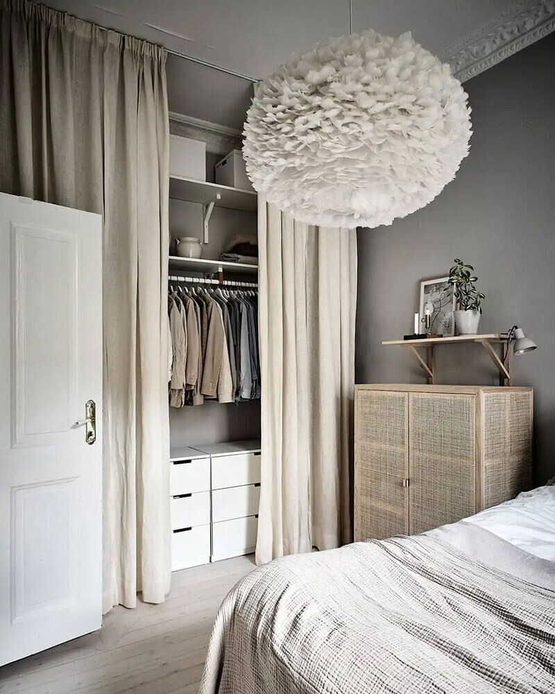 За портьерами можно не только спрятаться от соседей напротив, но и спрятать гардеробную систему. Шторы тоньше, чем фасады или дверь — места займут немного. Их легко отодвинуть и задвинуть обратно.