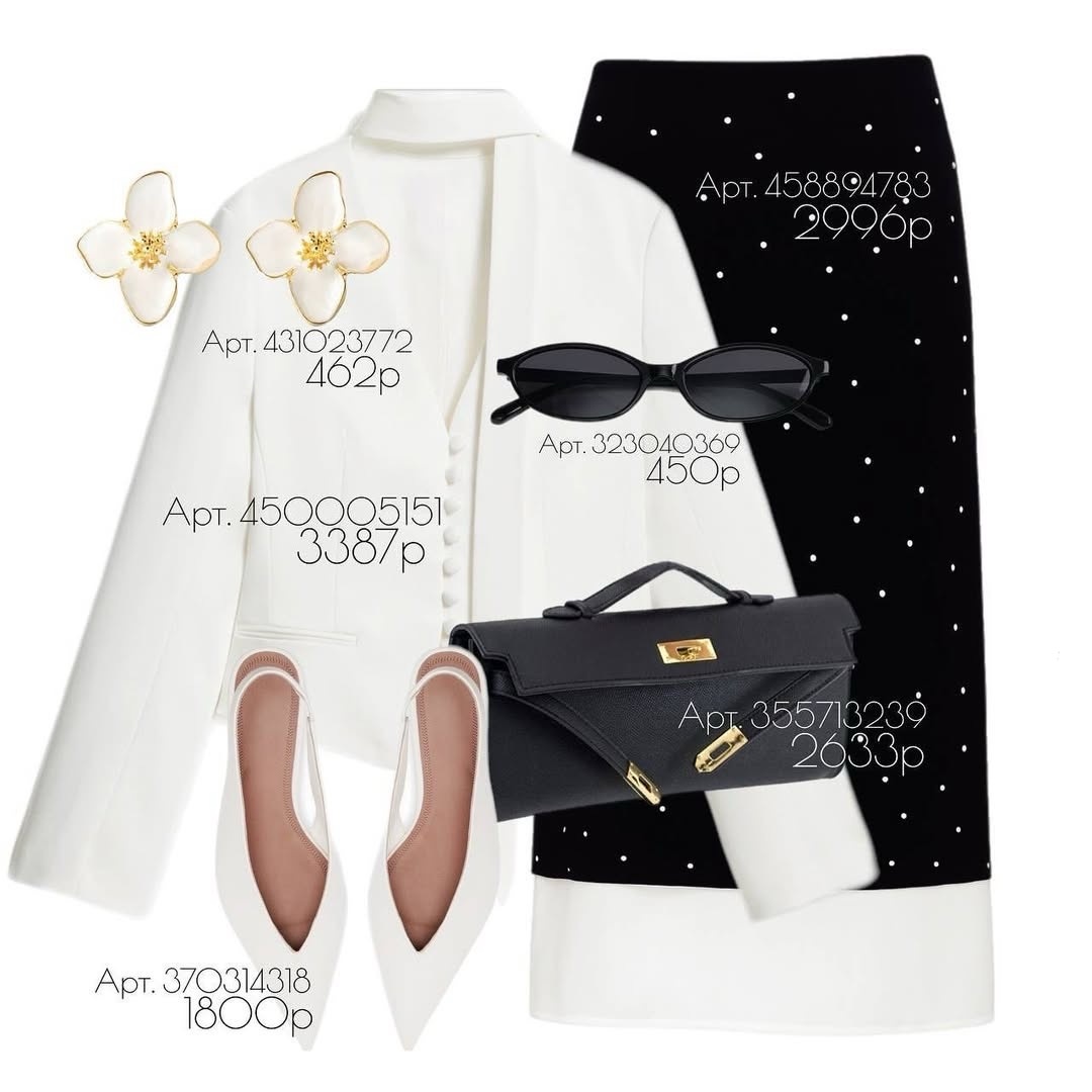 Монокром — самый простой способ выглядеть безупречно, а микс белоснежного жакета и «маленькой чёрной» юбки в горошек — это и ретро-шарм, и современная строгость одновременно. Разбираем комплект строго по артикулам: что именно брать на WB, как сидит каждая вещь и за счёт каких деталей образ выглядит «дорого».