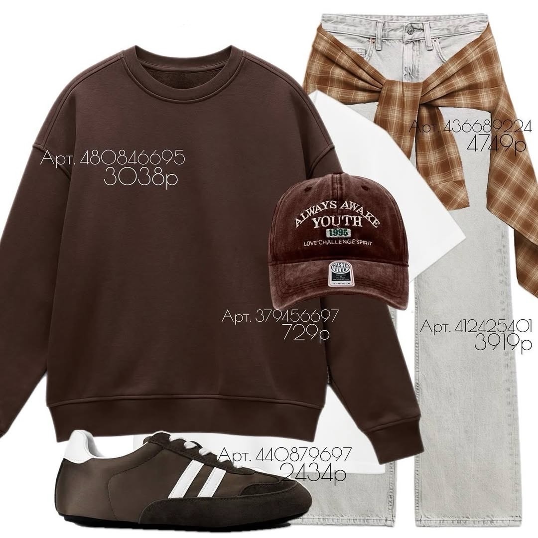 Тёплые кофейные оттенки + спортивные силуэты = идеальный casual для города, поездок и прогулок на выходных. В этом комплекте всё про мягкий комфорт, но без потери формы: грамотные пропорции, чистые линии и «вкусная» палитра капучино с молочной пенкой. Разбираю образ строго по артикулам и показываю, как каждую вещь использовать на максимум. База, которая задаёт настроение. Свитшот глубокого шоколадного оттенка со спущенной линией плеч и круглым воротом. Плотный футер держит форму, не «облипает», а аккуратно отвисает — за счёт этого силуэт выглядит чище и стройнее. Манжеты и низ на резинке фиксируют объём и создают правильную горизонталь на бёдрах. Совет стилиста. Подворачивайте пояс на 1 раз и слегка выпустите ткань — так появится едва заметный «бабл-эффект», который визуально делает талию тоньше. Для слоёв надевайте под низ белую футболку с видимым краем. Карамельно-бежевая клетка — идеальный мост между коричневым свитшотом и молочными деталями. Здесь рубашка завязана узлом на талии —