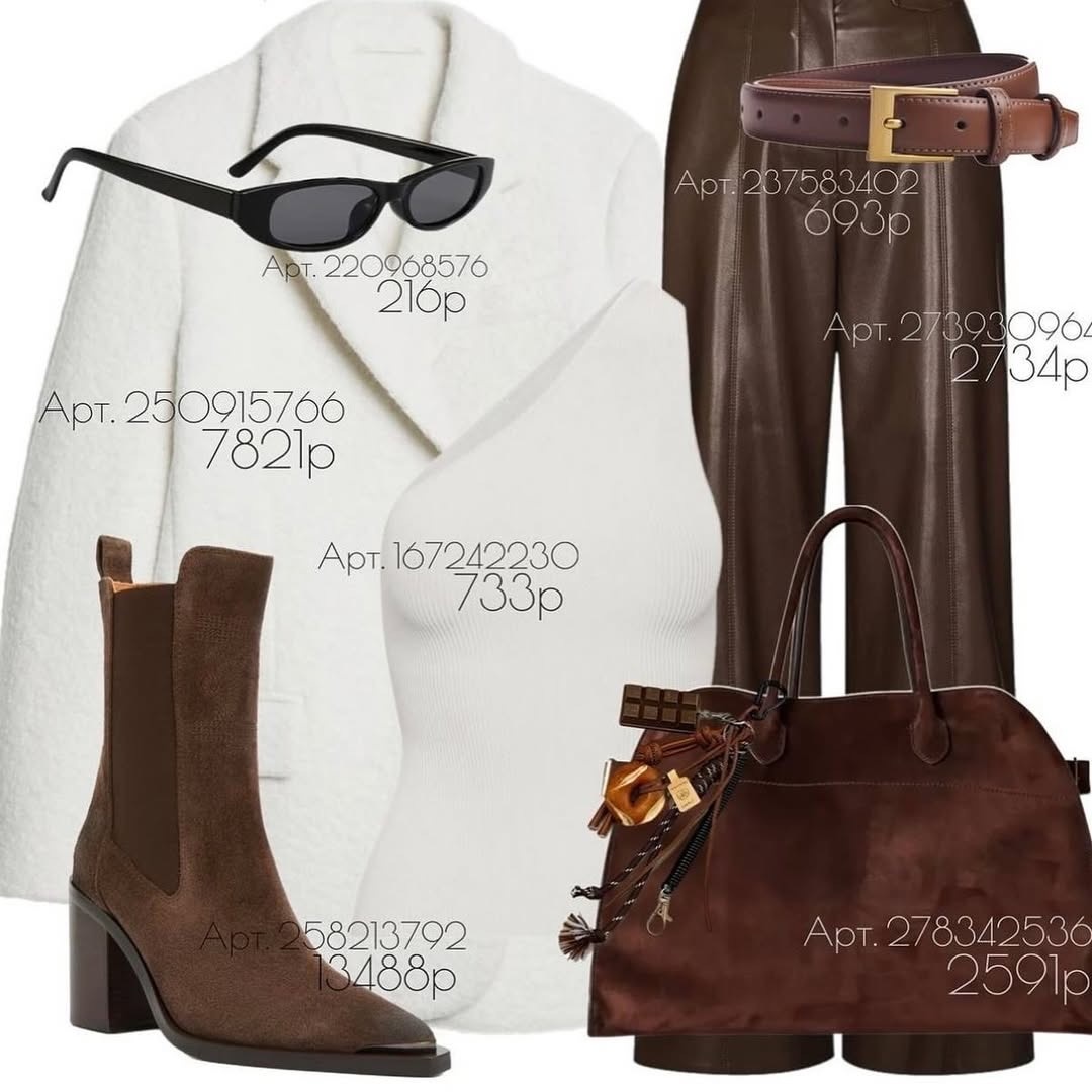 Перед вами тот самый универсальный лук, который выглядит дороже ценника: молочный верх, шоколадный низ и игра фактур — кожа, замша, шерсть. Образ собран так, чтобы стройнить, вытягивать силуэт и оставаться актуальным несколько сезонов подряд. Разбираем каждую вещь по артикулам и даём лайфхаки, как носить.