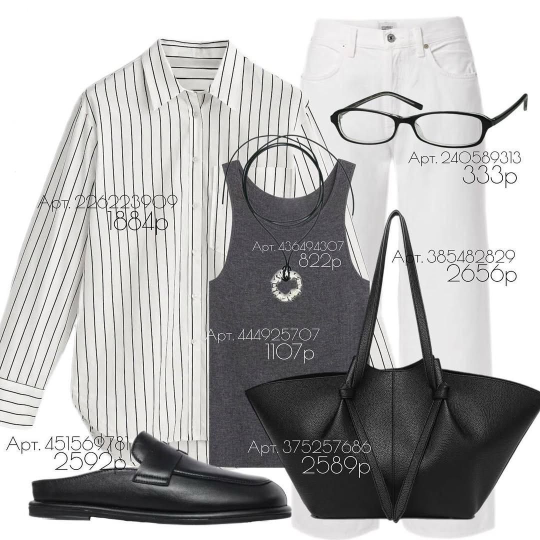 Ничего лишнего — только чистые линии, правильные пропорции и продуманная палитра «чёрное-белое-графит». Такой комплект работает всегда: на работу в свободный день, на встречу в городе, в поездку. Разбираю каждую вещь из образа и показываю, как получить максимум стиля при минимуме времени. Лёгкая, струящаяся и при этом держит форму. Вертикальная узкая полоска визуально вытягивает силуэт и делает плечи аккуратнее. Длина позволяет носить навыпуск, завязывать узлом или заправлять частично (французская заправка). Манжеты с классической планкой, воротник средней стойки — рубашка выглядит «дороже», чем стоит. Совет стилиста: подворачиваем рукава до линии косточки на запястье — так открываются щиколотки/кисть и силуэт кажется легче. Если рост ниже среднего, оставляйте пару нижних пуговиц расстёгнутыми и заправляйте только перед — появится вертикаль. Эластичный риб с плотностью, достаточной для аккуратного прилегания без просвечивания. Графит «успокаивает» контраст чёрного и белого и работает