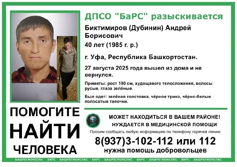 В Уфе пропал 40-летний Биктимиров (Дубинин) Андрей Борисович. 27 августа 2025 года вышел из дома и не вернулся, сообщают волонтеры поискового отряда ДПСО «Барс». Рост 180 см, худощавого телосложения, волосы русые, глаза зеленые. Был одет в зеленую толстовку, черное трико, черно-белые полосатые тапочки. Мужчина нуждается в медицинской помощи. Контактный телефон: 8-937-3-102-112 или 112.
