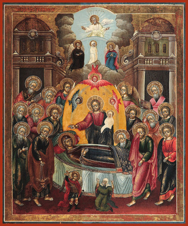 В Успении Пречистая первой среди человечества воскресает в теле еще до Страшного Суда и поднимается в небеса, к высшей их точке, на самую границу между тварным и нетварным, становясь “одесную” Бога. Вместе с Богородицей преображается и становится небесной вся человеческая природа, и эпоха всеобщего Воскресения в тайне начинается.