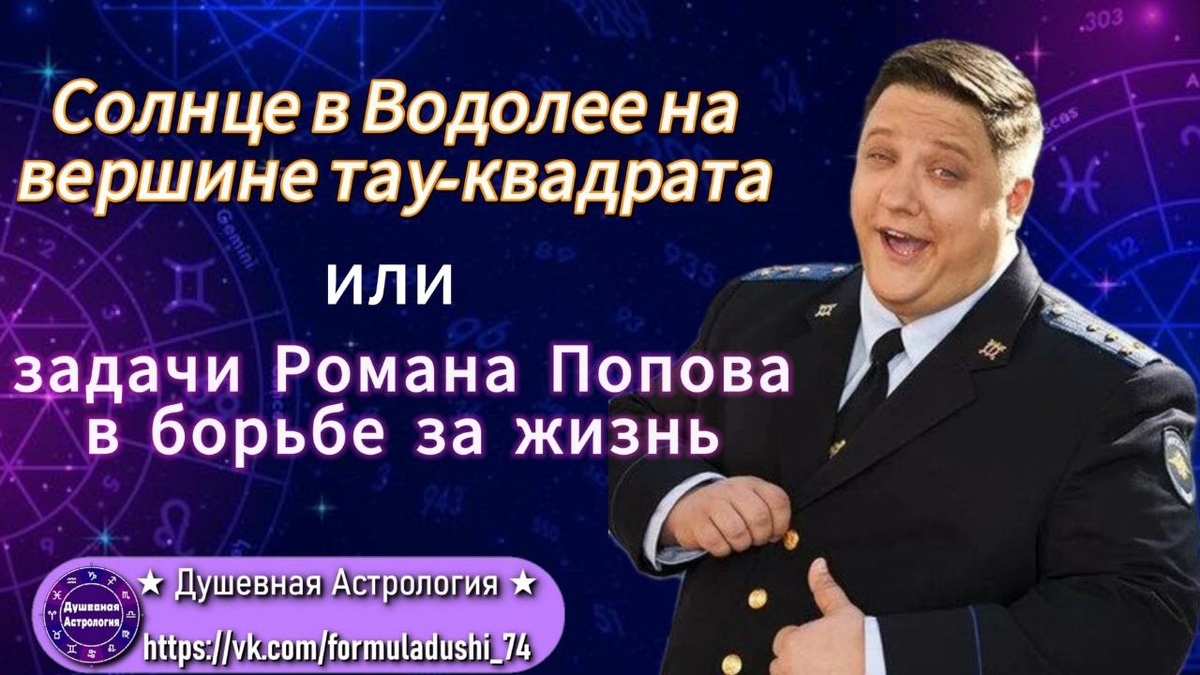 Как видно из биографии Романа Попова, получать образование ему стало скучно, вместо этого он выбрал КВН, телевидение и бессменно юмористический жанр, все свои силы направил на построение карьеры комика, юмориста, телезвезды и зарабатывание денег. При этом Солнце в аспекте с нисходящим кармическим узлом в соединении с Сатурном подсказывает, что программа карьеры у Романа Попова уже отработана, и строить карьеру не является его основной задачей в этом воплощении.