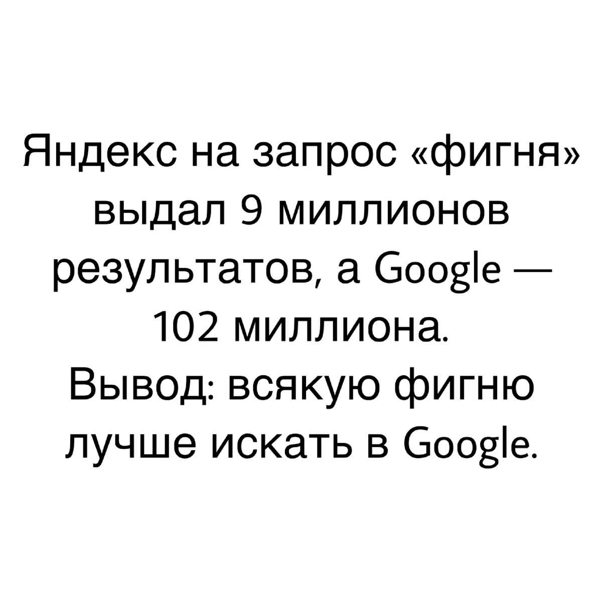 Яндекс на запрос «фигня» выдал 9 миллионов результатов, а Google — 102 миллиона.