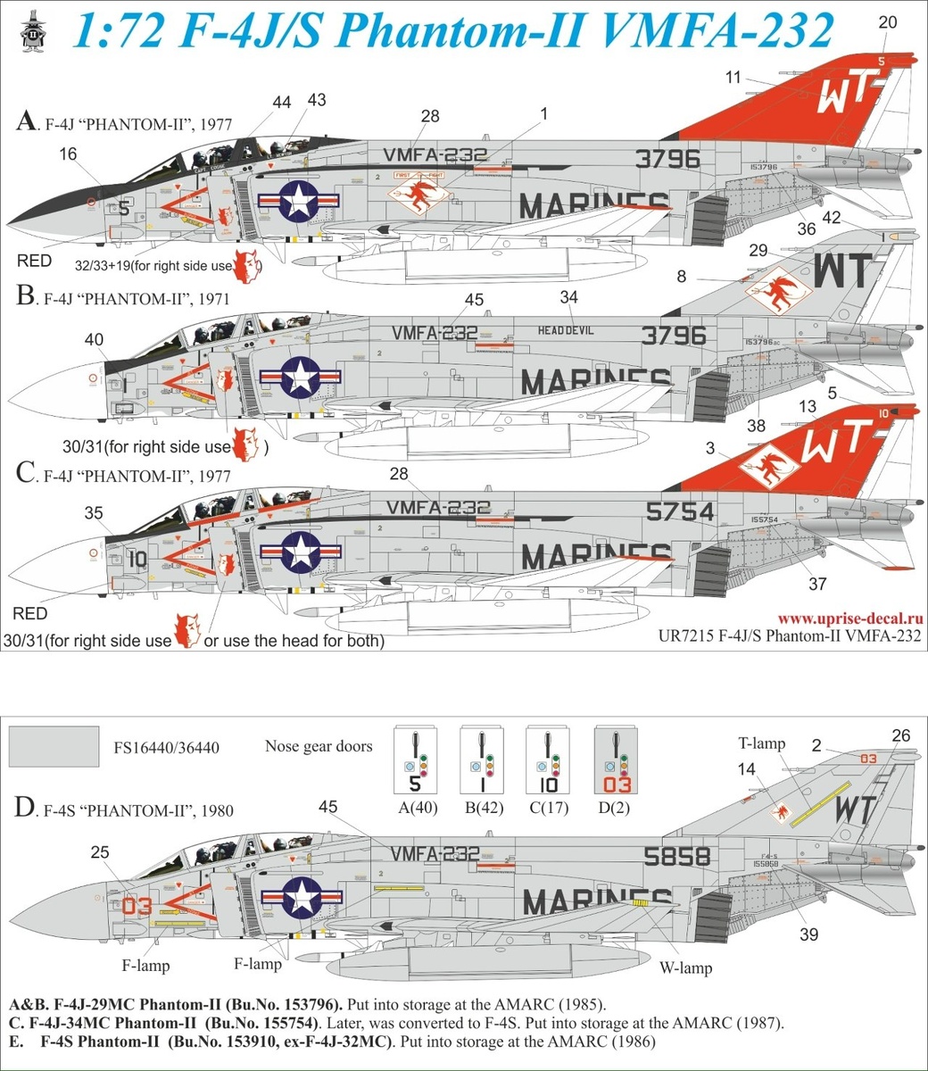 Санкт-петербургская Uprise Decal выпустила по технологии FFA (с удаляемой лаковой подложкой) декали для моделей F-4J/S Phantom-II из VMFA-232 в масштабах 1/72 (на фотографиях) и 1/32, а также и по обычной технологии с не удаляемым лаком - в масштабе 1/48.
