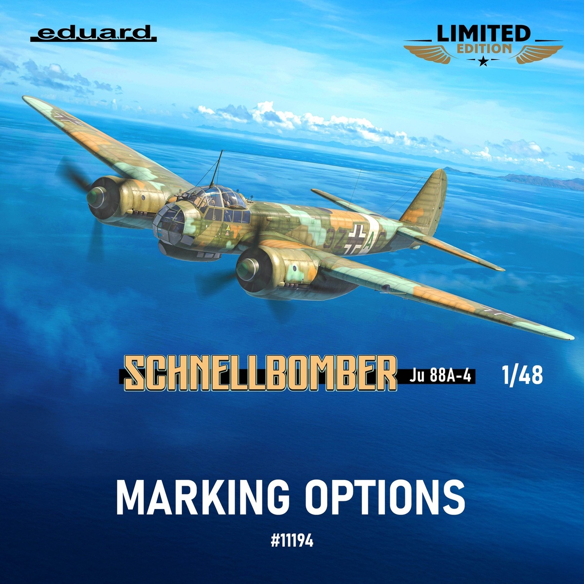 Eduard из Чехии показала варианты окраски своей сентябрьской перепаковки модели Ju 88A-4 в масштабе 1/48 разработки ICM 2015 года. В набор добавлены декаль, цветное фототравление и смоляные колеса шасси собственно от Eduard: Schnellbomber Ju 88A-4 (каталожный номер 11194)