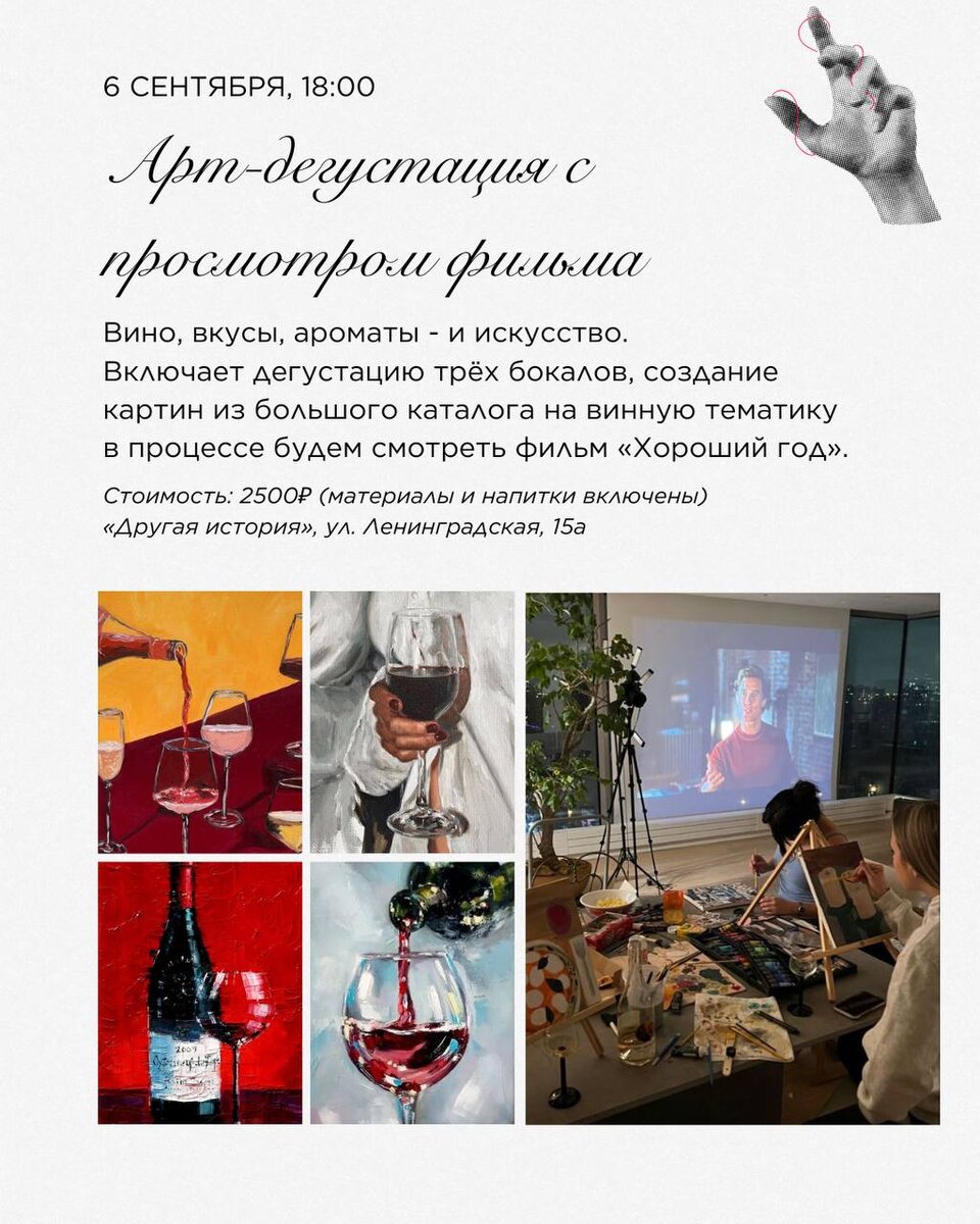 Три сорта вина, винная живопись и кинопросмотр