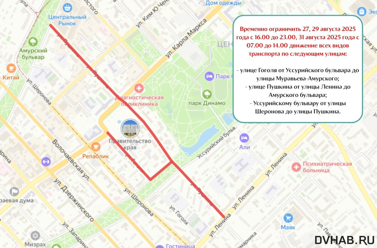- улице Гоголя от Уссурийского бульвара до улицы Муравьева-Амурского;- улице Пушкина от улицы Ленина до Амурского бульвара;- Уссурийскому бульвару от улицы Шеронова до улицы Пушкина.
