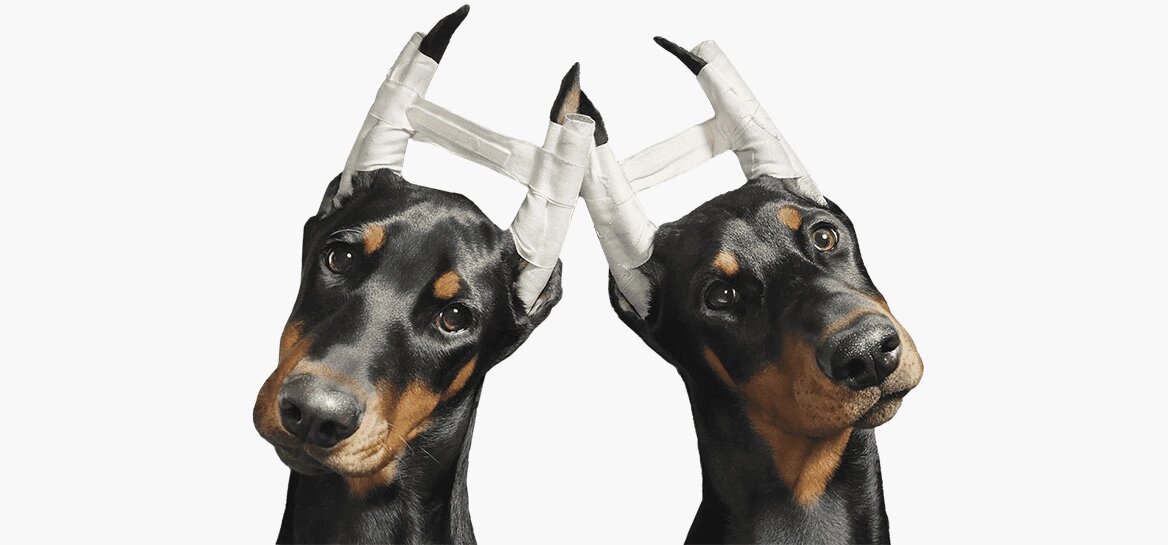 Купирование ушей у собак — это древняя практика, уходящая корнями в античность. В прошлом собаки использовались на охоте, в войнах и для охраны, и стоячие укороченные уши помогали защитить животное от травм при схватках с врагом или дикими животными. Для добермана процедура стала частью стандарта уже при выведении породы её создателем Луисом Доберманом в XIX веке. Основная задача — обеспечить собаке более защищённый и функциональный экстерьер для служебной работы, придать им грозный и уверенный вид — что очень важно для сторожевой породы. Операцию обычно проводят щенкам в возрасте от 7 до 12 недель, когда хрящи ещё мягкие и быстро заживают. После хирургического удаления части ушной раковины уши фиксируют в вертикальном положении пластырями и бинтами на несколько недель до окончательной постановки. Уход за купированными ушами требует тщательного контроля: регулярные перевязки, осмотры на предмет инфекции, аккуратная гигиена и при необходимости помощь ветеринара. Несмотря на долгую тр