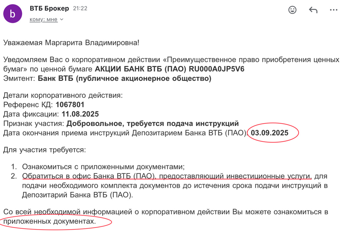 Теперь текстом в дополнение к голосу ВТБ решил ценовой диапазон не сообщать. То есть даже без ориентира по цене запустил сбор заявок по ПремПраву. Это допустимо. Может, в конце концов, ценового диапазона вообще не будет, а сразу финальная цена. Поэтому сейчас просто подаём заявку на покупку акций VTBR по ПремПраву вслепую. Ведь эта заявка нас ни к чему не обязывает, зато в будущем создает возможность гарантированно (без всяких аллокаций) купить новые акции VTBR из допки по цене допки (если эта цена нас устроит). Не путать заявку по ПремПраву с заявкой на покупку акций из допки в общем порядке (как при IPO/SPO). В общем порядке сбор заявок ещё не начался. Сейчас пока только ПремПраво в процессе. Подать заявку-поручение своему брокеру на покупку акций VTBR по корп.действию «преимущественное право приобретения» акций VTBR (тип корп.действия PRIO, референс 1067801). Порядок подачи заявки (личный визит, чат и пр.) каждый уточняет у своего брокера. Но это точно не в стакане! Обычно у Тинь