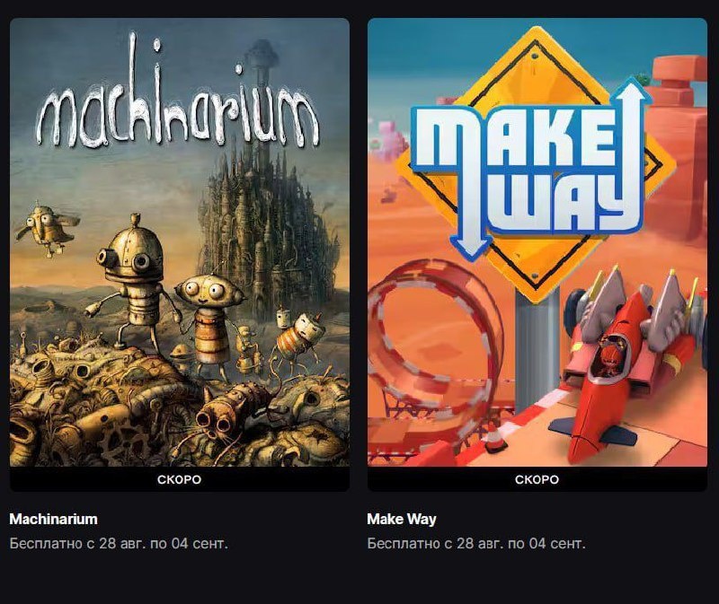 В Epic Games раздача — бесплатно можно получить 2 игры - Machinarium — помоги роботу Йозефу спасти его подругу Берту, похищенную бандитами - Make Way — проноситесь по петлям, через железнодорожные переезды, дрифтуйте по пересечениям и применяйте оружие Залутать халяву возможно до 4 сентября