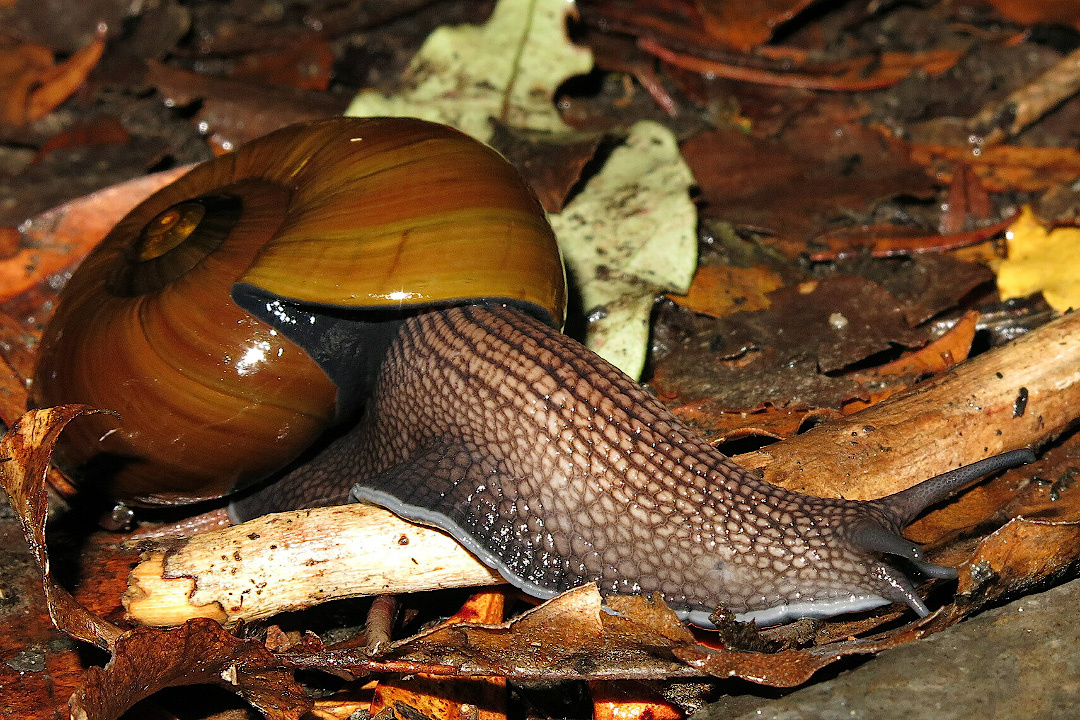 Привет, мои дорогие любители необычной земной фауны — давайте заглянем в ночной лес Новой Зеландии. Листва шуршит под лёгким дождём, и вдруг на тропинке блеснёт раковина размером с ладонь. Вы думаете: «Ну, улитка — и что?» Кажется смирной тихоней, а на деле — хищница, поедающая своих жертв заживо. Она ползёт медленно, но её движение обманчиво: шаг за шагом она приближается к добыче. На влажной земле блеснёт свежая дорожка, и уже через миг в поле зрения оказывается дождевой червь. Улитка прильнёт к нему ртом, и тот исчезнет сантиметр за сантиметром, втянутый в её тело. Наш герой — улитки рода Powelliphanta. Эти новозеландские моллюски входят в число крупнейших сухопутных хищных улиток в мире: их раковины достигают девяти сантиметров, а окрас играет золотистыми, коричневыми и пурпурными полосами. Живут они только в Новой Зеландии, в сырых лесах и на горных склонах. Каждое местообитание связано с влажной подстилкой, где водятся многочисленные черви. Именно сюда, в мшистые укрытия и подгни