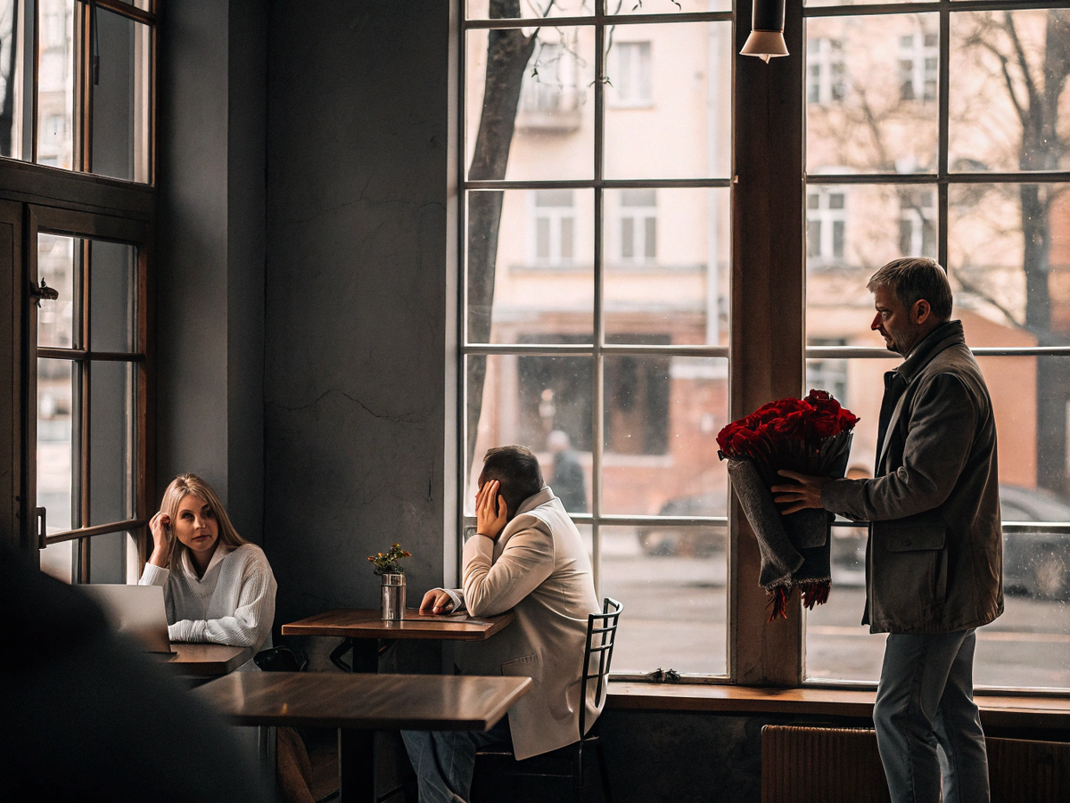 Владимир вошёл в кафе и направился к их столику. Когда он подошёл близко, Наталья подняла голову и увидела мужа. Её лицо мгновенно побледнело, глаза расширились от ужаса.