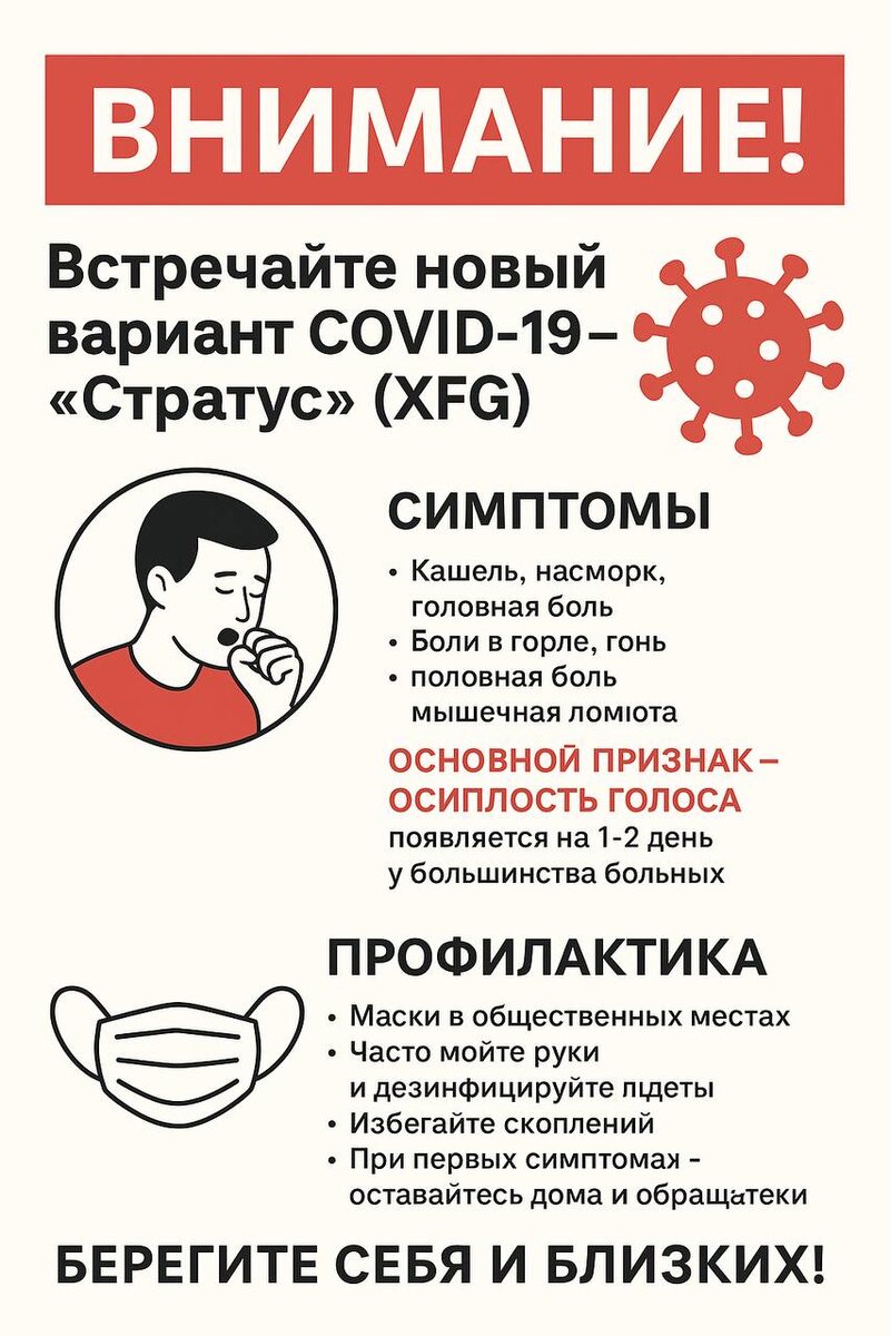 Внимание! Встречайте новый вариант COVID-19 — «Стратус» (XFG). Он легко переносится, но очень заразен. Симптомы: • Кашель, насморк, головная боль, ломота, слабость, субфебрилитет • Основной признак — осиплость голоса, появляется на 1–2 день у большинства больных Профилактика: • Маски в общественных местах • Часто мойте руки и дезинфицируйте гаджеты • Избегайте скоплений людей • При первых симптомах — оставайтесь дома и обращайтесь к врачу Берегите себя и близких! #Стратус #COVID19 #осиплость #вирус #профилактика #здоровье