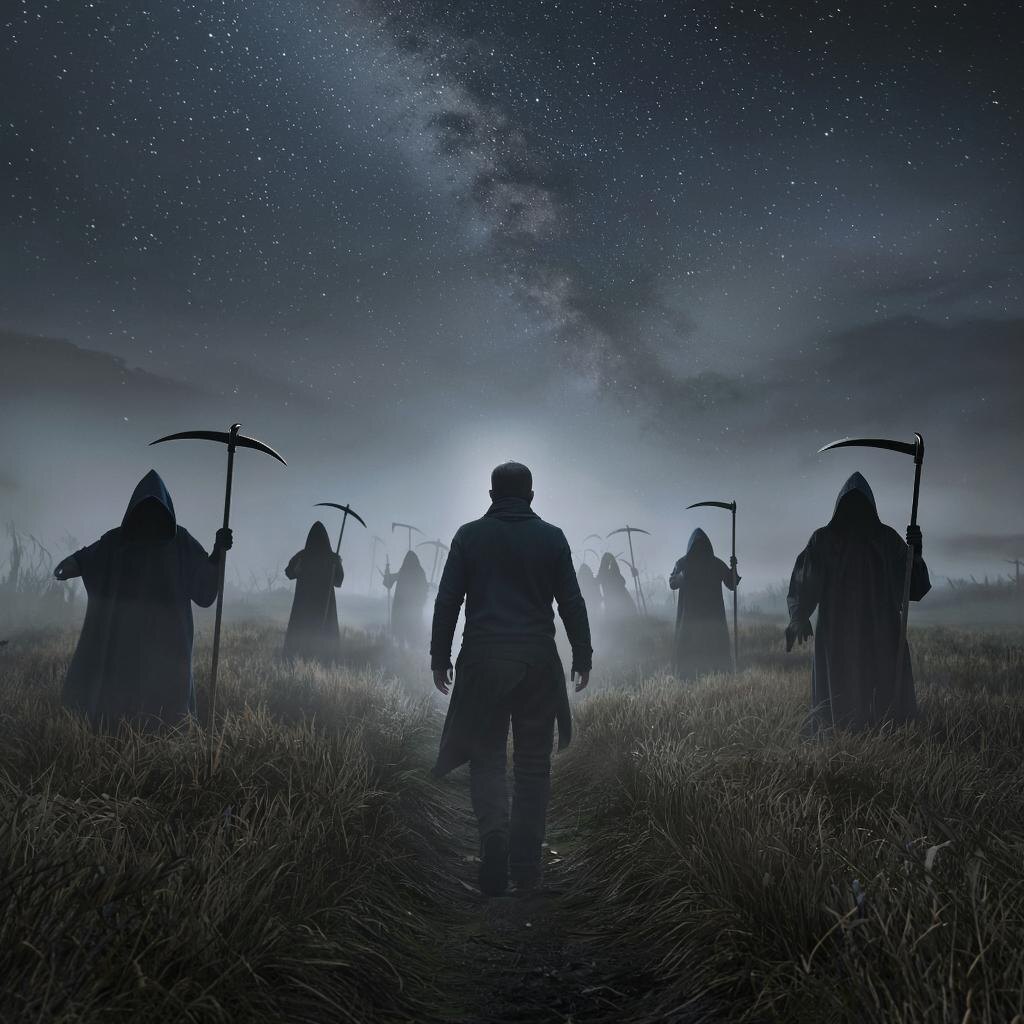 Ночь опустилась быстро, словно чёрное покрывало накрыло землю без единого звука. Поле передо мной расстилалось необъятным полотном, тихо шептавшимся о чём-то таинственном. Дорога вела вперёд, её едва различимый след терялся во мраке, но другого пути не было. Я шагал медленно, прислушиваясь к своим шагам, которым вторило эхо моего сердца. Вокруг стояла такая густая тишина, будто весь мир замер в ожидании чего-то страшного и неизбежного. И вдруг я почувствовал чей-то взгляд. Необычный, пронзающий до костей. Обернувшись назад, увидел лишь черноту ночи, холодную и неподвижную. "Наверняка показалось", – подумал я, продолжив путь дальше. Но ощущение чужого присутствия становилось сильнее. Оно липло ко мне, подобно мокрой ткани, от которой невозможно избавиться. С каждым шагом страх нарастал, заставляя сердце биться быстрее, громче, отчаяннее. Вдруг краем глаза я уловил движение впереди. Нечто двигалось рядом с дорогой, плавно, почти незаметно. Оглянулся ещё раз и понял, что это не одино