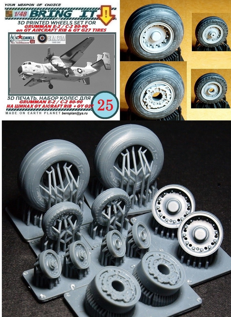 Bring It! из Уфы выпустила на 3D-принтере колеса шасси для моделей E-2 Hawkeye/C-2 Greyhound 1980-90-х годов в масштабе 1/48. Основные колеса с шинами 36х11" Good Year Aircraft Rib, тормозные механизмы Good Year. Передние колеса с шинами 20x5.5" Good Year G27 с оригинальным протектором с боковыми грунтозацепами на дисках BF Goodrich.