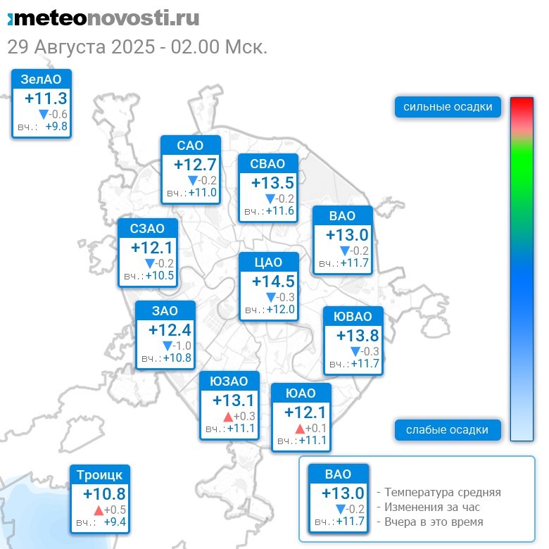 В 2:00 в Москве было от +9°C до +14.7°C, средняя температура +12.7°C #погода #Москва #лето #температура #29августа #пятница