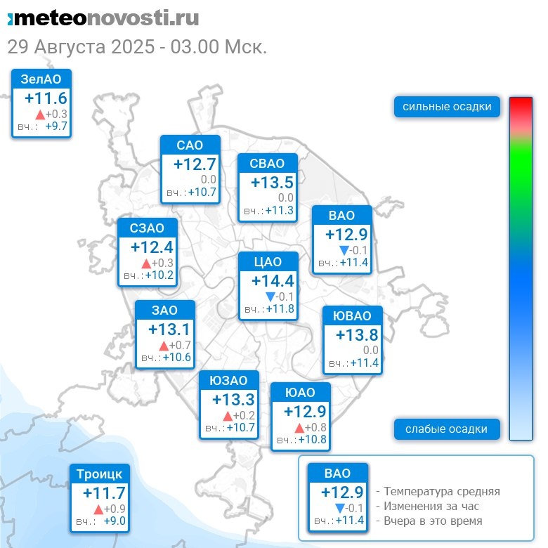 В 3:00 в Москве было от +10.8°C до +14.6°C, средняя температура +13°C #погода #Москва #лето #температура #29августа #пятница Перейти на сайт Прогноз погоды на 14 дней