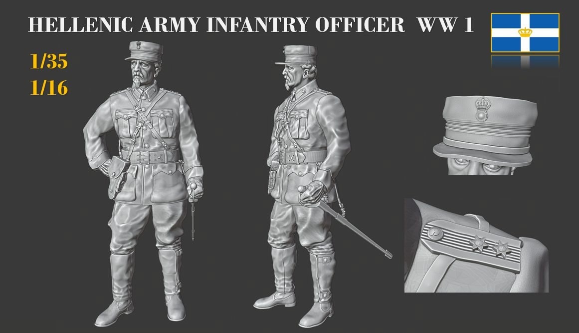 MODEL 3D INT из Греции выпускает на 3D-принтере фигуры греческого иполохагоса (лейтенанта) пехоты периода Первой мировой войны и кампании 1919-1922 годов в масштабах 1/35 и 1/16.