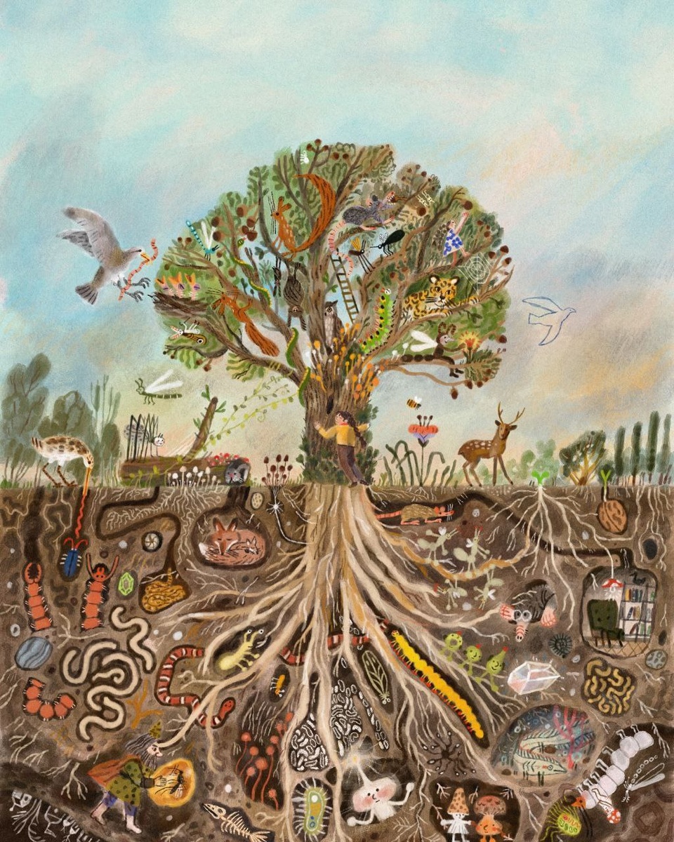 Любое дерево - это не 1 существо, а сообщество множества существ находящихся друг с другом в сложных взаимоотношениях. Кто-то с кем-то находится в симбиозе, кто-то кого-то ест, кто-то кого-то использует просто как убежище или опору. И всем хорошо. Художник: Sebastian Ilabaca