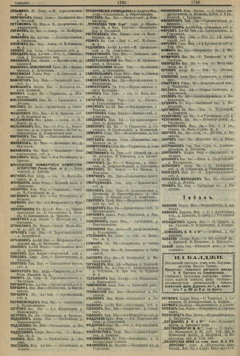 И вот, в 1902 году, в разделе табака, нашла: Забродин Гаврила Яковлевич. Сухаревская площадь. Сейчас тут — сквер вместо Сухаревой башни, украшающей площадь и снесенной в 1934 году. А в 1900-е — тут кипел шумный рынок, и табаком торговал мой дед. Удивительно! Когда открываешь точки на карте, связанные с твоими предками, то время словно сжимается и вот уже я иду по оживленной площади, минуя коробейников и ловлю теплое ощущение осмысленности и близости с корнями.
