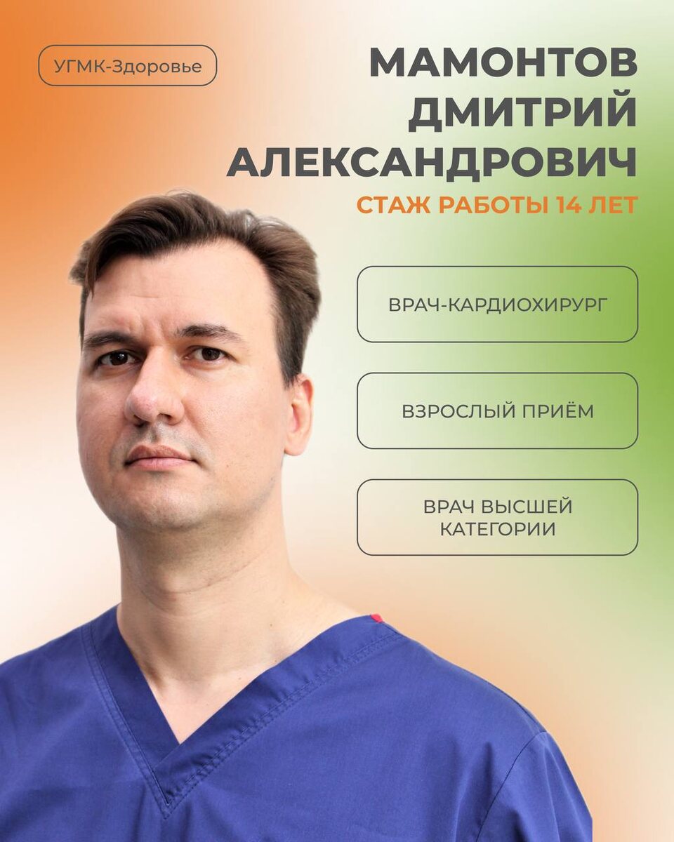✏ Знакомимся со специалистом клиники «УГМК-Здоровье» В клинике «УГМК-Здоровье» ведет прием Мамонтов Дмитрий Александрович, врач-кардиохирург В каких направлениях работает специалист? 🔸Определение показаний к коронарографии 🔸Коронарное шунтирование через минидоступ 🔸Коррекция приобретённых пороков сердца, в том числе из минидоступа 🔸Хирургия врождённых пороков сердца 🔸Операции при патологиях аорты 🔸Послеоперационное наблюдение 🔸Предоперационное обследование 🔸Подготовка к кардиохирургическим вмешательствам Записаться на консультацию можно на нашем сайте или по номеру телефона +7 343 283 08 08. Позаботьтесь о своем здоровье и доверьте его профессионалам! 💙
