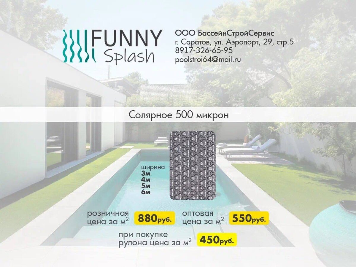 🌊✨ Солярное покрытие для бассейна: Теплая вода без лишних затрат!✨🌊 🔹 Наше солярное покрытие специально разработано для эффективной работы с водой. Оно действует по принципу парника: улавливает солнечное тепло и направляет его прямо в воду, не давая ей остывать ночью. 🔹Сокращение испарения воды: Покрытие уменьшает испарение воды до 50%, а значит, вам реже придется доливать воду и тратить деньги на ее подготовку (химию и фильтрацию). 🔹Чистота воды: Покрытие защищает воду от попадания листьев, насекомых и другого мусора, сохраняя ее чище и сокращая время на уборку и количество химических средств. 🔹Высокое качество и долговечность: Полотно изготовлено из прочного, устойчивого к ультрафиолету (UV) и химикатам материала (вспененного полиэтилена или PVC). Оно не трескается на солнце, выдерживает перепады температур и прослужит не один сезон. Для получения подробной информации и консультации: 📩 Пишите нам в ЛС или звоните- 89173266595 Сергей (WhatsApp; Telegram) Почта: poolstroi64