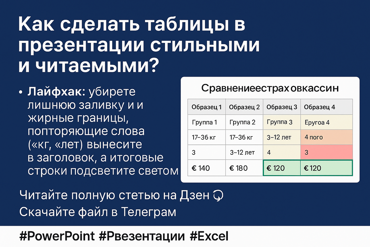 Узнайте, как преобразить даже самую сложную таблицу в PowerPoint. Правила оформления, оптимизация данных, акценты и цветовые приёмы. Полный разбор с практическими примерами. Таблицы в PowerPoint — это инструмент, без которого не обходится ни одна бизнес-презентация. Но именно таблицы чаще всего портят впечатление: перегружены границами, заливками, повторяющимися словами, а цифры и заголовки сливаются в сплошной «шум». В результате вместо ясной визуализации — тяжёлый для восприятия массив. В этой статье мы пошагово разберём, как оформить таблицу в PowerPoint так, чтобы она выглядела стильно, минималистично и при этом доносила главную мысль. По умолчанию PowerPoint добавляет таблицам цветные фоны и жирные границы. Это создаёт «визуальный шум» и мешает видеть сами данные. Что делаем: Так данные начинают «дышать», а таблица выглядит лёгкой. Повторяющиеся слова забивают таблицу.
