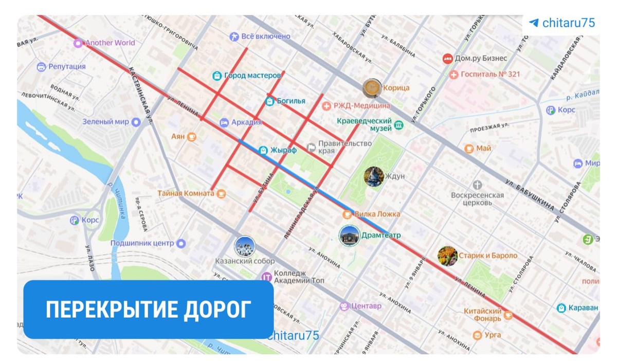 Через час центр Читы будет перекрыт для репетиции военного парада на площади Ленина. По данным тг-канала администрации города, дороги перекроют с 15:00 до 23:00, для всего транспорта, кроме общественного. Полностью движение закроют с 17:30 до 23:00. Улица Ленина будет перекрыта очень масштабно — от Кирова до Генерала Белика, также будет закрыт Агинский тракт от АЗС № 6 до Кирова и Генерала Белика от Крымской до Комсомольской. 📌📌📌📌📌 Новости Читы и Забайкалья
