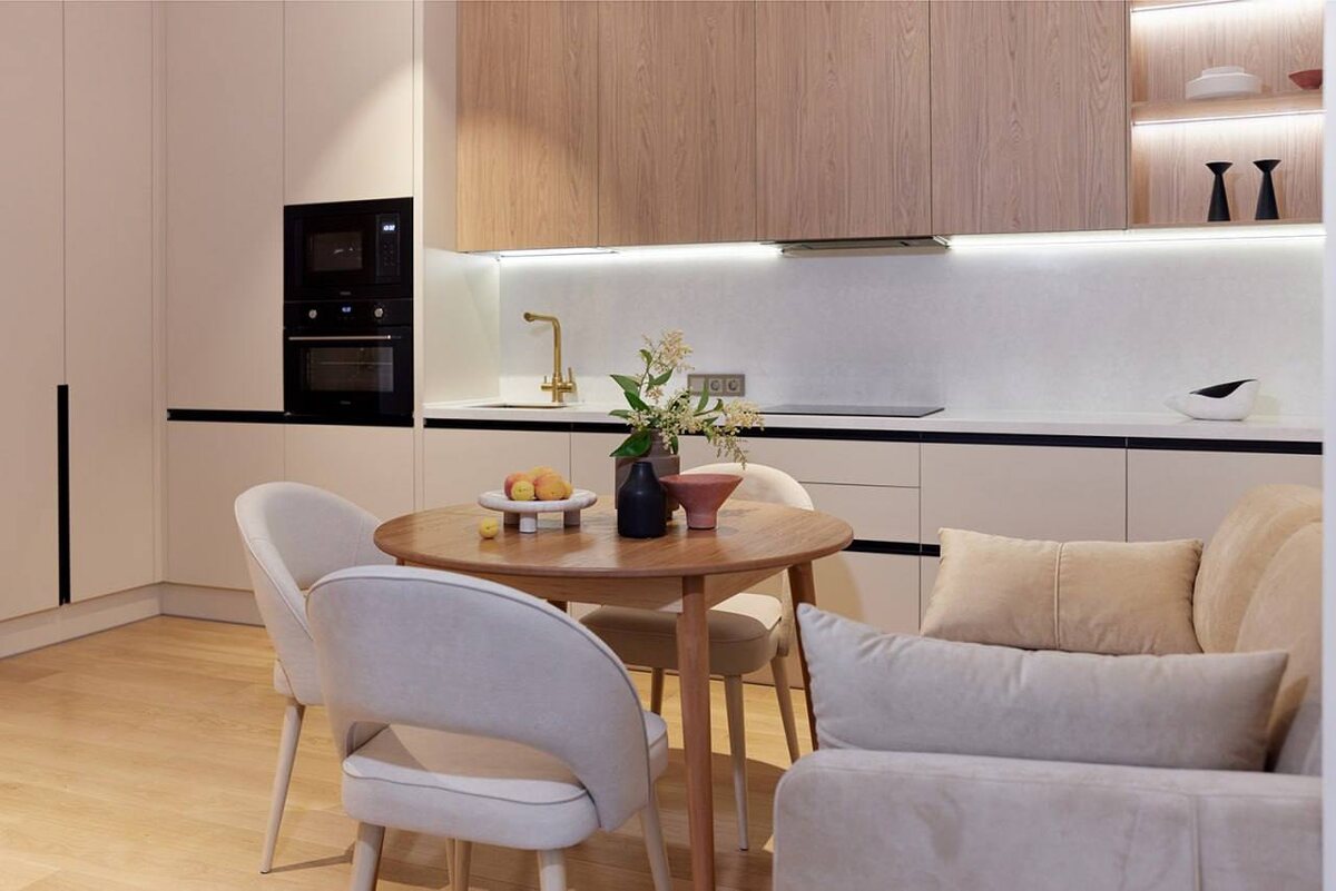 Продолжаем рассказывать про реализацию нашего дизайн-проекта в резиденции Мантера. ⬇️ Остановимся на кухне. Застройщиком под неё была выделена очень длинная стена (около 5 метров) и угол (напомню, квартира под сдачу в аренду - большая кухня особо не нужна), но зато не было места для шкафа/гардероба при входе. При разработке планировки мы добавили вместительный шкаф по одной стене, а по другой разместили встроенный холодильник и колонну с техникой (стиральная машина, духовой шкаф, микроволновая печь). Эти два крупных пенала сократили излишнюю длину столешницы кухни и она стала смотреться гармоничнее. 👌 Кухня и шкаф производства Bellini_kuhni +7 988 166 9933